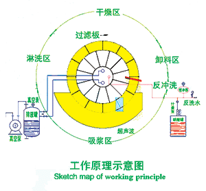 | 工作原理: 吸漿區(qū):工作時浸沒在料漿的過濾板在毛細(xì)作用下結(jié)合真空壓力,表面吸附成一層濾餅,濾液通過濾板進(jìn)分配閥至排液罐。 淋洗區(qū):濾餅轉(zhuǎn)出料漿斗后,對濾餅進(jìn)行噴淋洗滌。 干燥區(qū):濾餅繼續(xù)在水環(huán)真空泵高真空力的作用下脫水。 卸料區(qū):進(jìn)入無真空的情況下,刮刀自動卸料。 反沖洗:工業(yè)水或濾液通過分配閥進(jìn)入陶瓷板由內(nèi)向外進(jìn)行清洗。清洗堵塞的微孔。在陶瓷板使用一個周期后,采用超聲波配合低濃度酸混合清洗,保持陶瓷板的高效使用。 |
