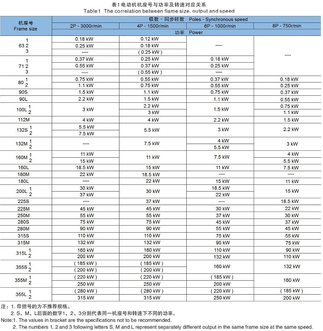 1、電機(jī)機(jī)座號與功率及轉(zhuǎn)速對應(yīng)關(guān)系