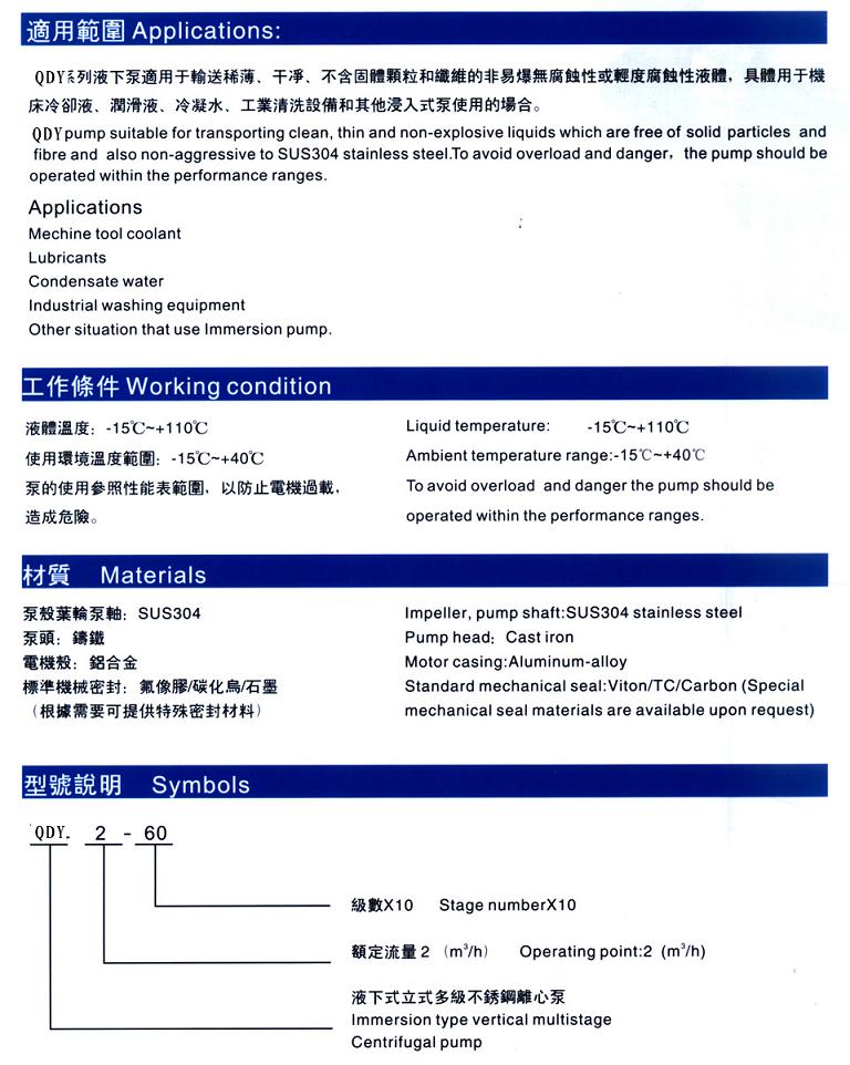 QDY不銹鋼多級液下泵主要零部件如葉輪、導(dǎo)流器、泵軸用不銹鋼制造,不銹鋼多級液下泵所有過流部件、觸液部件均為不銹鋼制造,具有良好的耐腐蝕性能,采用硬質(zhì)合金軸承及機械密封,剛性聯(lián)軸器傳動,具有體積小、重量輕、抗腐蝕、振動小、噪音低、占地面積小、使用壽命長,外形美觀等特點,特別是高效、節(jié)能等優(yōu)點。