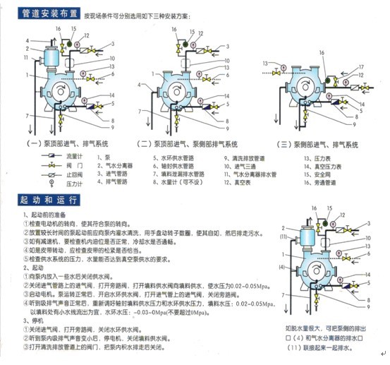 結(jié)構(gòu)設(shè)計完善:裝有柔性閥板的排氣口,保證了工作過程的平穩(wěn);配有自動排水閥,避免超液位起動;當(dāng)加裝防汽蝕裝置時,可以防止較高真空運行時的汽蝕損害;加裝噴淋裝置時,可以使高溫氣體在進入泵前作充分的降溫收縮,增加泵的抽氣能力。