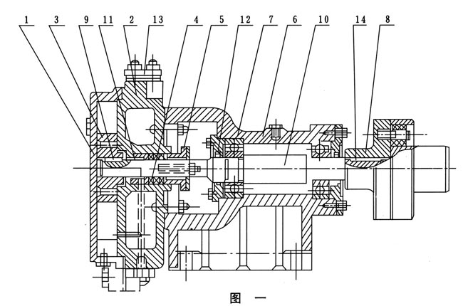 由鑄鐵制成葉輪(3),有l(wèi)2個(gè)葉片呈放射狀均分布,有平衡孔(其中兩個(gè)套扣供拆卸用)平軸向力?谑喥芥I(9)與軸(10)聯(lián)接并可沿軸向滑動(dòng)調(diào)節(jié)間隙。軸為優(yōu)質(zhì)鋼制成,支承在泵的托架(6)內(nèi)的兩個(gè)滾珠軸承(17)上右端有彈性聯(lián)軸器(8)和電機(jī)直接聯(lián)接。托架(6)用鑄鐵制成,有止口保證與泵體準(zhǔn)確聯(lián)接,軸承間有空腔,可存潤(rùn)滑油,用稀油或黃油滑均可。