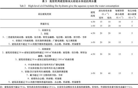 高層建筑的消防用水總量應(yīng)按室內(nèi)、外消防用水量之和計算。如果高層建筑內(nèi)設(shè)有消火栓、自動噴淋、水幕、泡沫等滅火系統(tǒng)時,其室內(nèi)消防用水量應(yīng)按需要同時開啟的滅火系統(tǒng)用水量之和計算。高層民用建筑室內(nèi)、外消火栓給水系統(tǒng)的用水量,不應(yīng)小于表3的規(guī)定。
