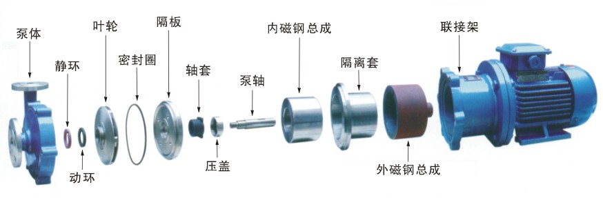 磁力泵主要構(gòu)件是泵體、葉輪、內(nèi)磁鋼、外磁鋼、隔離套、泵內(nèi)軸、泵外軸以及滑動軸承、滾動軸承、聯(lián)軸器等組成。