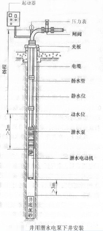 采用鋼管下井安裝的并用潛水電泵,其安裝方法如圖。