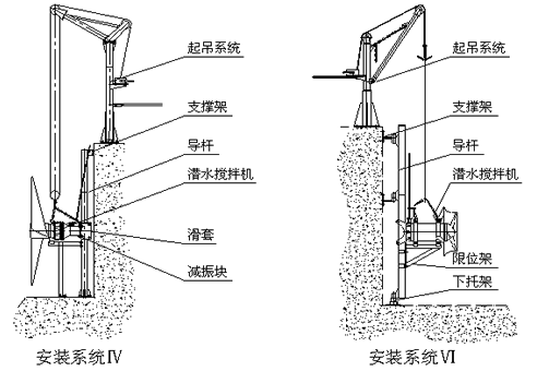 安裝系統(tǒng)Ⅰ只適用池深<4m,機型為QJB0.85/8-260/3-740C和QJB1.5/6-260/3-980C攪拌機,其中Ⅰ-1可在水平方向和垂直方向進行調(diào)節(jié);