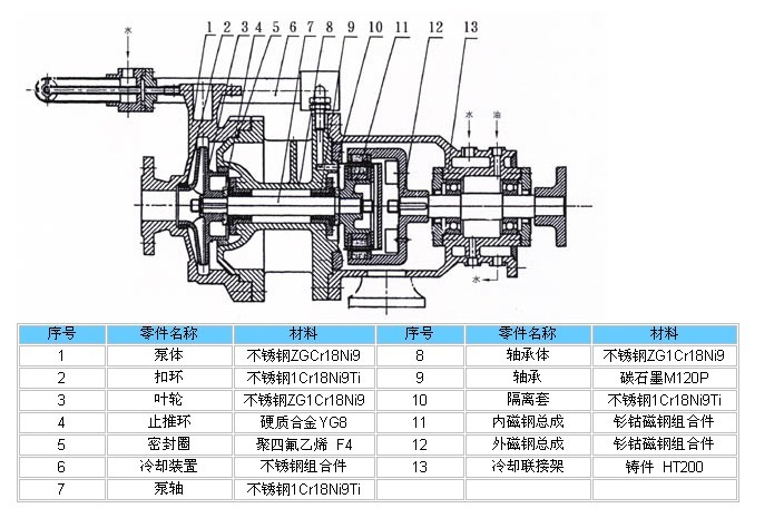 4、傳動部分:泵與原動機采用膜片式加長聯(lián)軸器部件連接,檢修時,只需將聯(lián)軸器中間膜片卸下,即可進行磁力泵的檢修。