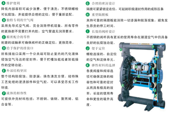 使用方便、工作可靠、開停只需簡單地打開和關(guān)閉氣體閥門,即使由于意外情況而長時間無介質(zhì)運行或突然停機,氣動不銹鋼隔膜泵也不會因此而損壞,不旦超負荷,泵會自動地停機,具有自我保護性能,當負荷恢復(fù)正常后,又有自動啟動運行; 結(jié)構(gòu)簡單、易損件少,該氣動不銹鋼隔膜泵結(jié)構(gòu)簡單,安裝、維修方便,泵輸送的介質(zhì)不會接觸到配氣閥,聯(lián)桿等運動部件,不象其他類型的泵因轉(zhuǎn)子、活塞、齒輪、葉片等部件的磨損而使性能逐步下降; 可輸送較粘的液體(粘度在1萬厘泊以下); 本泵無須用油潤滑,即使空轉(zhuǎn),對氣動不銹鋼隔膜泵也無任何影響,這是該泵一大特點。