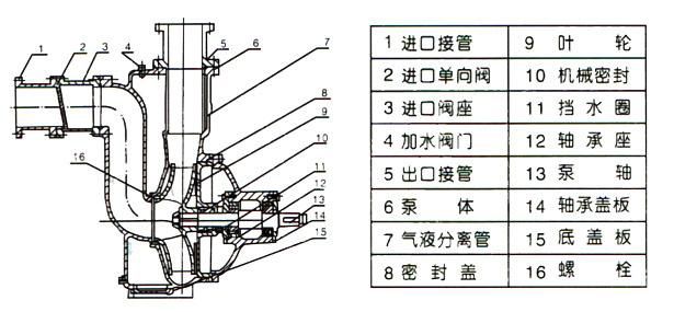 ZW系列自吸無(wú)堵塞排污泵,主要由泵體、葉輪、后蓋、機(jī)械密封、泵軸、軸承座、進(jìn)口閥、氣液分離管、加水閥門、進(jìn)、排接管等組成。泵的結(jié)構(gòu)見(jiàn)下圖。