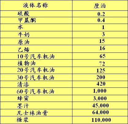 根據(jù)流體的粘度,類比出我們常見(jiàn)的物質(zhì):