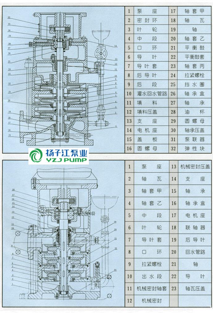 LG型泵的主要零件有:泵座、中段、后段、葉輪、導葉套、導葉、后導葉、支座、電機座、軸、軸承、軸套、密封環(huán)、平衡鼓、平衡鼓套等。(25LG、32LG、40LG三種泵沒有平衡鼓和平衡鼓套,而設(shè)有水封環(huán).裝在填料腔的底部。