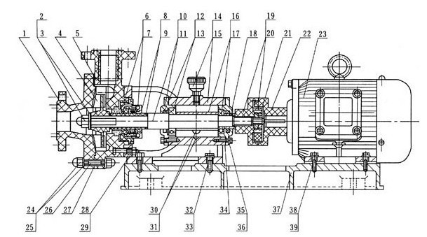 6、如果更換滾珠軸承或泵軸時,必須折下機架,松開前端軸承蓋4只螺釘,折下泵軸后端園螺母和聯(lián)軸節(jié),將泵軸向前端方向打出即可,再后折下后端軸封蓋。