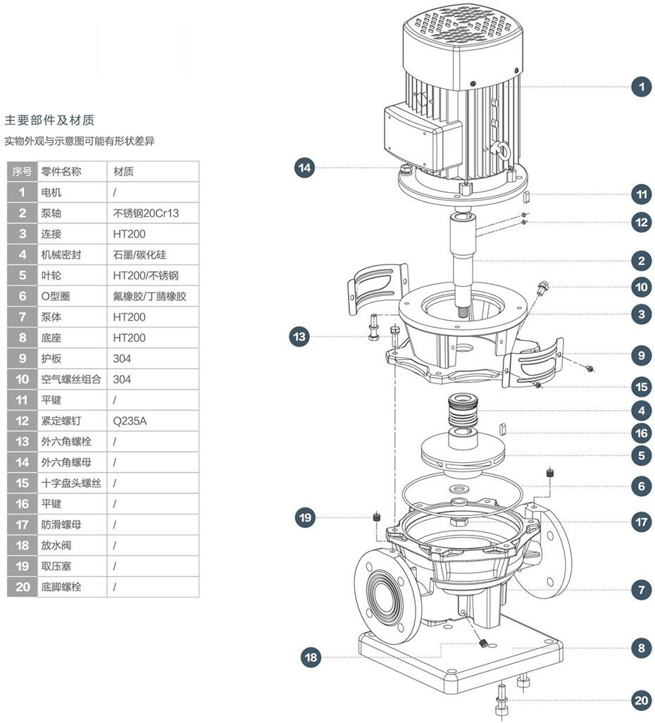 2、葉輪直接安裝在電機(jī)軸上,從而保證泵的同心度,因而增強(qiáng)了泵的運(yùn)行穩(wěn)定性和延長泵的使用壽命。
