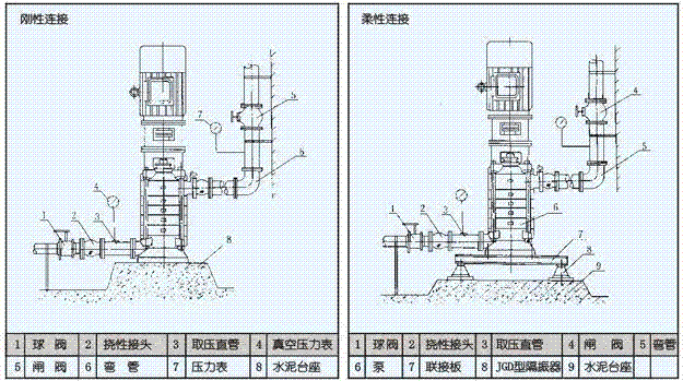 3.泵與底座安裝有兩種方式,一種是直接裝在水泥基礎(chǔ)上的剛性連接,另一種是采用JGD型減振器安裝的柔性連接,具體方法見安裝示意圖所示。