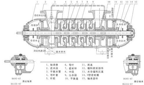 次高壓泵一般采用滑動(dòng)軸承、稀油潤(rùn)滑結(jié)構(gòu),DG85-6 7、DG155-67型泵可采用滑動(dòng)軸承、 稀油潤(rùn)滑,也可采用滾動(dòng)軸承、干油潤(rùn)滑結(jié)構(gòu),其余型號(hào)均采用滾動(dòng)軸承、干油潤(rùn)滑結(jié)構(gòu)。中、低壓泵的主要零件材料一般采用優(yōu)質(zhì)鑄鐵,次高壓泵主要零件采用鑄鋼或不銹鋼。該系列泵通過(guò)彈性聯(lián)軸器由原動(dòng)機(jī)直接驅(qū)動(dòng),從原動(dòng)機(jī)方向看,泵為順時(shí)針?lè)较蛐D(zhuǎn)。
