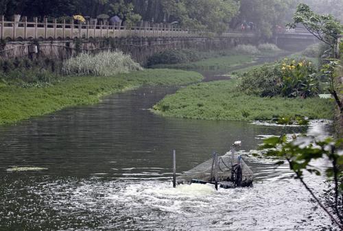 溫州市區(qū)九山外河中,一臺(tái)潛水離心式曝氣機(jī)正在工作,產(chǎn)生涌泉般的水流像“趵突泉”,給河面增添了幾分生氣!∵@種造流曝氣機(jī)工作時(shí)能給河水充氧,提高水體溶解氧的濃度,增強(qiáng)水體的自凈能力,以改善水質(zhì)。在長約1公里的九山外河,共有20套造流曝氣機(jī),每天工作8小時(shí)。此外,外河道里還種植了旱傘草、美人蕉等挺水植物,以及睡蓮等浮水植物,共同組成河道的生態(tài)修復(fù)工程。