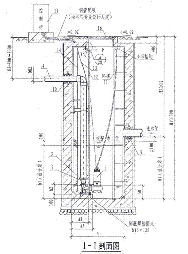 說明:1.本圖潛水排污泵采用液位自動控制。兩臺泵輪換工作,互為備用。h1為開泵水位,h0為停泵水位,當水位高出報警水位100mm時備用泵自投。
