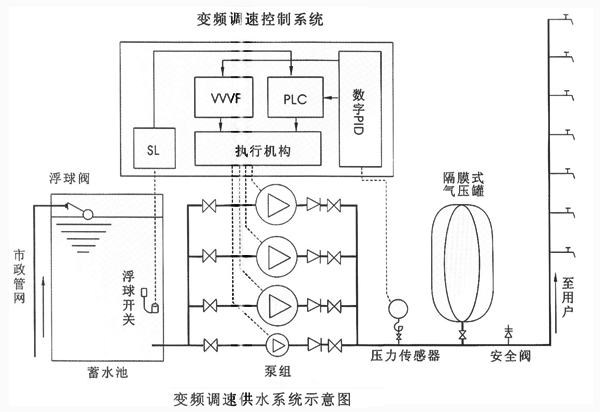 供水主泵組主要由DL型立式多級離心泵、GDL型立式多級不銹鋼泵和以槽鋼和鋼板焊接制成的鋼制基礎(chǔ)構(gòu)成,一般由2—3臺同一型號水泵組成。變頻調(diào)整供水控制系統(tǒng)主要由交流變頻調(diào)壓器、可編程控制器(微機)、數(shù)字PID調(diào)節(jié)器、外圍操作執(zhí)行機構(gòu)及保護電路、壓力傳感器、蓄水池液位控制器(水源缺水保護用)等組成。