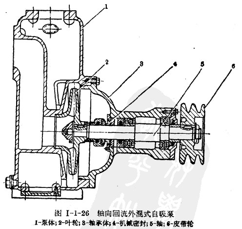 該圖為軸向回流式結構,相當于單蝸殼離心泵加一儲水室,儲水室有回流孔與蝸殼相通,水從軸向回流入葉輪外緣及外部。