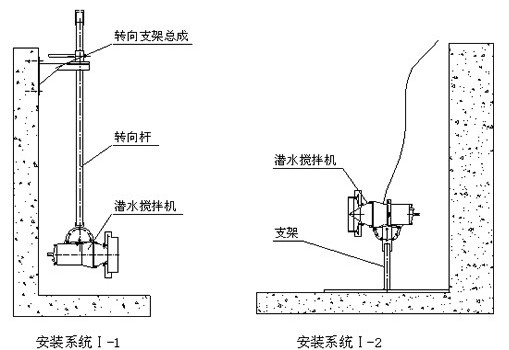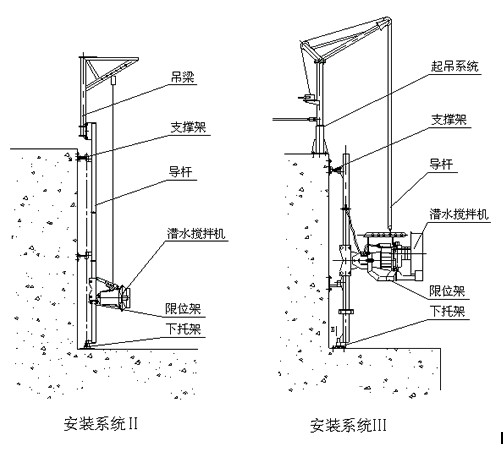 安裝系統(tǒng)Ⅰ只適用池深<4m,機(jī)型為QJB0.85/8-260/3-740C和QJB1.5/6-260/3-980C攪拌機(jī),其中Ⅰ-1可在水平方向和垂直方向進(jìn)行調(diào)節(jié);