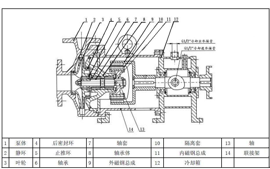 1、殼體部分:由泵體、泵蓋等組成,它承受泵的全部工作壓力;泵體葉輪水力形式符合API685標準,是磁力泵水力性能的主要表征零部件,其功能是強迫液體旋轉(zhuǎn),從而將原動機的機械能轉(zhuǎn)換成液體能量。