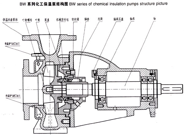 化工保溫泵是一種帶保溫夾套的單級單吸離心泵,它是在一般化工泵的基礎上改進而成的,主要適用于輸送低溫情況下易結晶的介質,或在某介質確保恒溫的情況下使用,可利用蒸汽或熱水保溫。由于泵結構及密封技術先進、科學、獨特,該泵可輸送含固量高達35%以下的物料;在正常情況下連續(xù)工作8000小時無泄漏,是一般化工泵密封效果的3-5倍,又因葉輪為開式結構,所以不會因介質含固量高而堵塞,該泵是目前化工行業(yè)輸送各種物料的理想的先進設備。