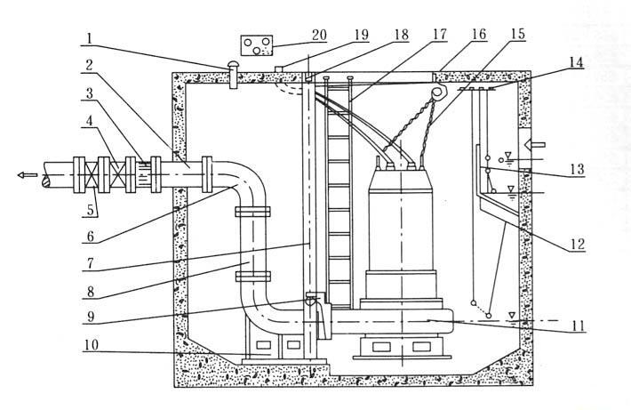 1.通風(fēng)節(jié) 2.預(yù)埋管 3.膨脹節(jié) 4.逆止閥 5.閘閥 6.彎管 7.導(dǎo)軌 8.出水管 9.支架 10.耦合底座 11.自動(dòng)攪勻排污泵