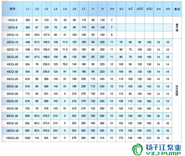 二、CQ型磁力驅(qū)動泵安裝尺寸表: