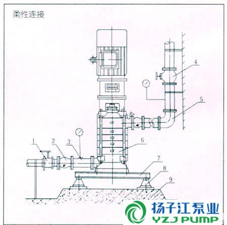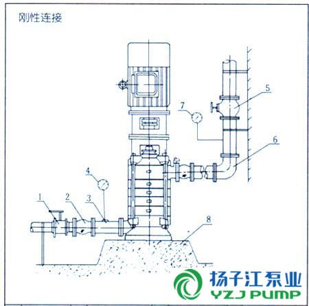 3. 泵與底座安裝有兩種方式,一種是直接裝在水泥基礎上的剛性連接,另一種是采用JGD型減振器安裝的柔性連接,具體方法見安裝示意圖所示.