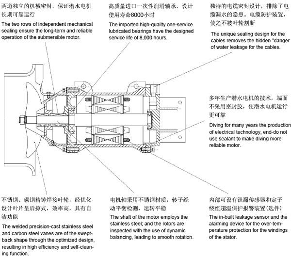 QJB型潛水?dāng)嚢铏C(jī)作為水處理工藝中的關(guān)鍵設(shè)備之一,在水處理工藝流程中,可實(shí)現(xiàn)生化過程中固液二相流和固液氣三相流的均質(zhì),流動的工藝要求。它由潛水機(jī)葉輪和安裝系統(tǒng)等組成。潛水?dāng)嚢铏C(jī)為直連式結(jié)構(gòu)。他于傳統(tǒng)的大功率電機(jī)通過減速機(jī)降速相比,具有結(jié)構(gòu)緊湊,能耗低,便于維護(hù)和保養(yǎng)等有點(diǎn)。葉輪經(jīng)過精鑄或沖壓成型,精度高,推力打,流線性造型簡潔美觀。該系列產(chǎn)品適用于需要固液攪拌,混合的場所。結(jié)構(gòu)簡圖如下: