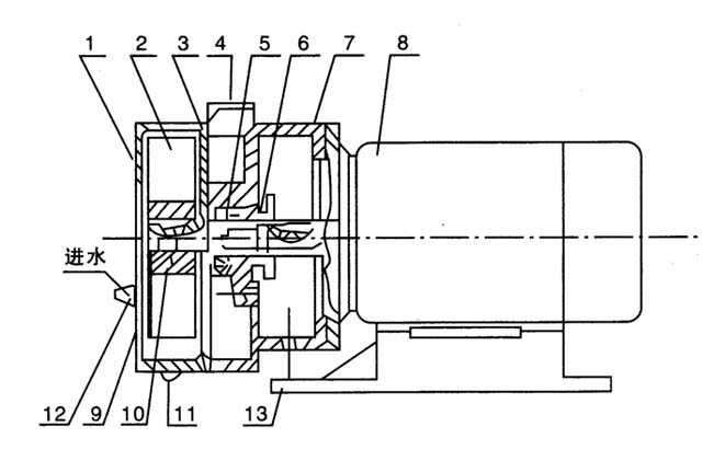 填料裝在泵體內(nèi),密封水經(jīng)泵體上的針孔流入填料中,葉輪形成水環(huán)所需的補充水經(jīng)由泵體上的彎頭供給,它可與自來水或汽水分離器聯(lián)在一起,供給循環(huán)水。