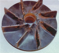 (1)汽蝕現(xiàn)象 對如右圖所示的入口管線,在0-0(位能基準(zhǔn)面)和K-K間列柏努利方程,得: 在貯槽液面上方壓力p0一定的情況下,若增加泵的安裝高度ZK(即Hg),則葉輪中心K處的壓力pK必然下降。當(dāng)ZK增加到使pK下降至被輸送液體在操作溫度下的飽和蒸汽壓時,則被輸送流體在葉輪中心處發(fā)生汽化,產(chǎn)生大量汽泡;汽泡在由葉片中心向周邊運動時,由于壓力增加而急劇凝結(jié),產(chǎn)生局部真空,周圍液體以很高的流速沖向真空區(qū)域;當(dāng)汽泡的冷凝發(fā)生在葉片表面附近時,眾多液滴尤如細(xì)小的高頻水錘撞擊葉片。此種現(xiàn)象稱作“汽蝕現(xiàn)象”。 離心泵在汽蝕狀態(tài)下工作時,泵體振動并發(fā)出噪音;壓頭、 流量大幅下降,嚴(yán)重時不能輸送液體;時間長久,在水錘沖擊和液體中微量溶解氧對金屬化學(xué)腐蝕的雙重作用下,葉片表面出現(xiàn)斑痕和裂縫,甚至呈海綿狀逐漸脫落(見右圖)。 通過以上討論可以看出,安裝高度過高將會導(dǎo)致葉輪中心處的壓力過低,從而發(fā)生汽蝕。只要泵的實際安裝高度低于允許安裝高度,則操作時就可避免發(fā)生汽蝕現(xiàn)象。