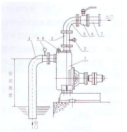 1.泵 2.壓力表 3.出口垂管 4.吸入硬喉管 5.彎頭 6.流量控制閥 7.出口管路 8.加液螺塞 9.真空表