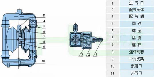 在泵的兩個對稱工作腔中,各裝有一塊有彈性的隔膜,聯(lián)桿將兩塊隔膜結成一體,壓縮空氣從泵的進氣頭進入配氣閥 后,推動兩個工作腔內的隔膜,驅使聯(lián)桿聯(lián)接的兩塊隔膜同步運動。與此同時,另一工作腔中的氣體則從隔膜的背后排出泵外。一旦到達行程終點。配氣機構則自動地將壓縮空氣引入另一個工作腔,推動隔膜朝相反方向運動,這樣就形成了兩個隔膜的同步往復運動。每個工作腔中設置有兩個單向球閥,隔膜的往復運動,造成工作腔內容積的改變,迫使兩個單向球閥交替地開啟和關閉,從而將液體連續(xù)地吸入和排出。![]() |