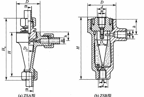 ②旋液分離器  旋液分離器(簡稱旋液器)是利用離心沉降原理來分離固體顆粒(顆粒密度大于化工泵密封流體的密度)的器件,其分離精度可達(dá)微米級。我國機(jī)械行業(yè)標(biāo)準(zhǔn)JB/T6633-1993《機(jī)械密封系統(tǒng)用旋液器》規(guī)定的機(jī)械密封系統(tǒng)用旋液器分為ZSA型與ZSB型兩種形式(見圖5-90),其工作參數(shù)為:壓力范圍0.4~6.3MPa;工作溫度為-20~200℃;工作流量2~8 L/min;工作介質(zhì)為含固相顆粒的液體。