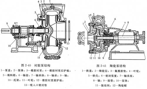 襯膠泵結構如圖2-40所示。其大流量可達1500m3/h,大揚程可達50 m,高使用溫度80℃,高使用壓力1.6 MPa。襯膠泵能用于輸送硫酸、鹽酸、磷酸、氫氟酸、氫氧化鉀等強腐蝕性介質(zhì),并適合輸送含有顆粒的腐蝕性液體,但不能用于輸送濃硫酸、濃硝酸等強氧化性酸。