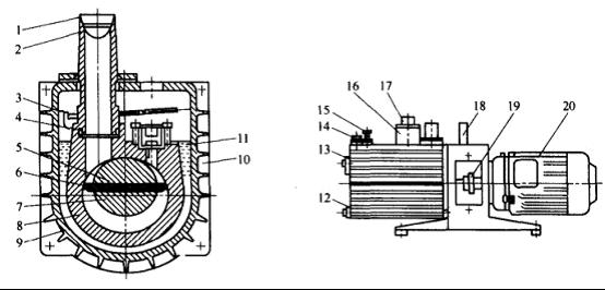 ![]() 圖1 旋片式真空泵結(jié)構(gòu)示意圖 1-進氣管;2-濾網(wǎng);3-擋油板;4-進氣管“O”形;5-旋片彈簧;6-旋片; 7-轉(zhuǎn)子;8-定子;9-油箱;10-真空泵油;11-排氣閥門;12-放泊螺塞; 13-油標(biāo);14-加油螺塞;15-氣鎮(zhèn)閥;16-減霧器;17-排氣管; 18-手柄;19-聯(lián)軸器;20-電機 |