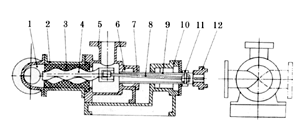 I-1B系列濃漿泵是單螺桿式容積回轉(zhuǎn)泵,該泵利用偏心單螺旋的螺桿在雙螺旋襯套內(nèi)的轉(zhuǎn)動,使?jié)鉂{液沿螺旋槽由吸入口推移至排出口,實現(xiàn)泵的輸送功能。