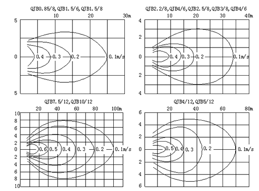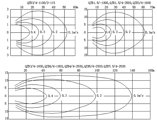 潛水?dāng)嚢铏C(jī)的選型是一項(xiàng)比較復(fù)雜的工作,選型的正確與否直接影響設(shè)備的正常使用,作為選型的原則就是要讓潛水?dāng)嚢铏C(jī)在適合的容積里發(fā)揮充分的攪拌功能,一般可用流速來(lái)確定。根據(jù)污水處理廠不同的工藝要求,潛水?dāng)嚢铏C(jī)佳流速應(yīng)保證在0.15~0.3m/s之間,如果低于0.15m/s的流速則達(dá)不到推流攪拌效果,超過(guò)0.3m/s的流速則會(huì)影響工藝效果且造成浪費(fèi)。所以在選型前首先確定QJB潛水?dāng)嚢铏C(jī)運(yùn)用的場(chǎng)所,如:污水池、污泥池、生化池;其次是介質(zhì)的參數(shù),如:懸浮物含量、粘度、溫度、PH值;還有水池的形狀、水深甚至安裝方式等都對(duì)選型產(chǎn)生影響,同時(shí)還應(yīng)考慮到節(jié)能因素,因?yàn)檫@將影響到用戶今后的運(yùn)行成本?蓞⒖枷旅娴臐撍?dāng)嚢铏C(jī)流場(chǎng)圖。
