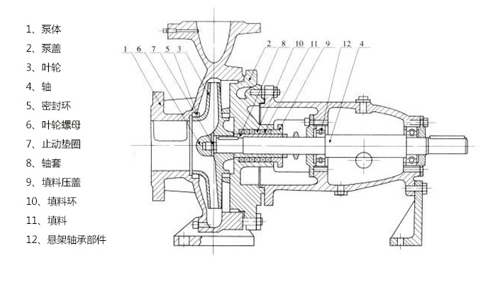 6、單級清水離心泵為避免軸磨損,在軸通過填料腔的部位裝有軸套保護。軸套與軸之間準有O型密封圈,以防止沿著配合表面進氣或漏水。