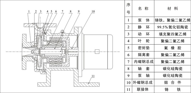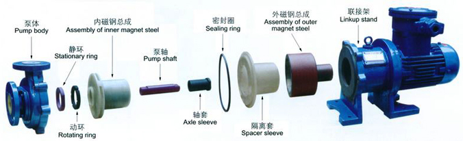 驅(qū)動(dòng)裝置采用主動(dòng)磁鐵聯(lián)軸器直接裝在電機(jī)軸上,泵室完全封閉,通過磁力偶合間接驅(qū)動(dòng)泵軸上帶磁鐵的葉輪旋轉(zhuǎn)結(jié)構(gòu)緊湊、安全節(jié)能。堅(jiān)固耐用的泵體結(jié)構(gòu)雖然接觸液體部分是氟塑料,但泵外殼是金屬材料,故泵體足以承受管道的重量及抵受機(jī)械性沖擊。氟塑料磁力泵由泵、磁力傳動(dòng)器、電動(dòng)機(jī)三部分組成。關(guān)鍵部件磁力傳動(dòng)器由外磁轉(zhuǎn)子、內(nèi)磁轉(zhuǎn)子及不導(dǎo)磁的隔離套組成。當(dāng)電動(dòng)機(jī)帶動(dòng)外磁轉(zhuǎn)子旋轉(zhuǎn)時(shí),磁場能穿透空氣隙和非磁性物質(zhì),帶動(dòng)與葉輪相連的內(nèi)磁轉(zhuǎn)子作同步旋轉(zhuǎn),實(shí)現(xiàn)動(dòng)力的無接觸傳遞,將動(dòng)密封轉(zhuǎn)化為靜密封。由于泵軸、內(nèi)磁轉(zhuǎn)子被泵體、隔離套完全封閉,從而徹底解決了“跑、冒、滴、漏”問題,消除了煉油化工行業(yè)易燃、易爆、有毒、有害介質(zhì)通過泵密封泄漏的安全隱患,有力地保證了職工的身心健康和安全生產(chǎn)。