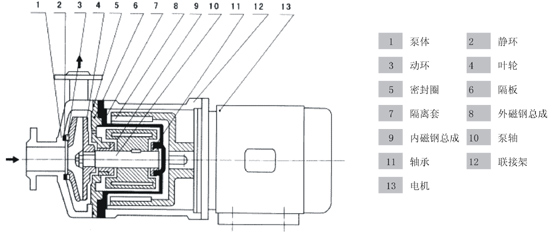 CQ型工程塑料磁力驅動泵(簡稱磁力泵),是應用現代磁學原理,將永磁聯軸器的工作原理用于離心泵的新型產品,磁力泵以靜密封取代動密封,使泵的過流部件處于完全密封狀態(tài),徹底解決了其它泵的機械密封無法避免的跑、冒、滴之弊病。磁力泵選用耐腐蝕、高強度的工程塑料、鋼玉陶瓷、不銹鋼作為制造材料,因此它具有良好的抗腐蝕性能,并可以使被輸送介質免受污染。